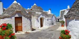В итальянском городке Альберобелло в провинции Бари можно увидеть причудливые остроконечные домики из известняка, которые строили без использования цемента. Каждый домик уникален строением крыши, рисунком на ней и магическим знаком на куполе.