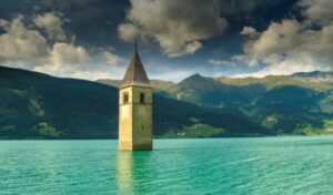 На севере Италии над озером Резия возвышается затопленная колокольня, построенная в XIV веке. Башня была затоплена в 1950 году в связи со строительством гидроэлектростанции. Проект предусматривал создание дамбы на месте двух деревень, полностью ушедших на дно.